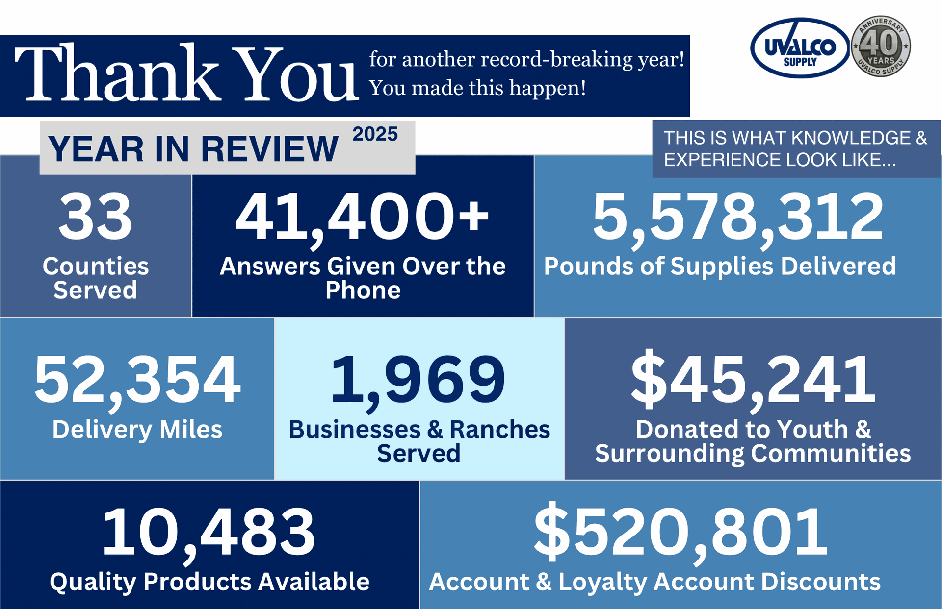 As we close out 2025, we want to say thank you to our customers, communities, and team members who made this another record-breaking year for Uvalco Supply. The numbers below tell the story of hard work, experience, and a deep commitment to serving South Texas ranchers, contractors, and businesses.